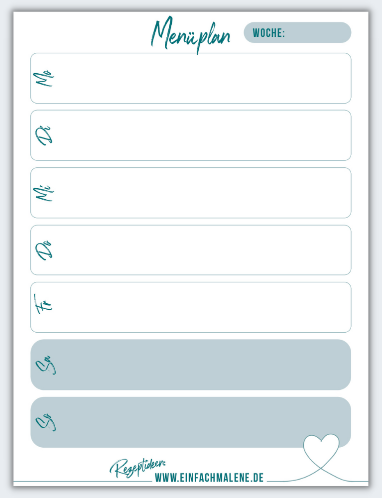 Mit diesem kleinen, handlichen Menüplan hast du deine Essensplanung für eine ganze Woche immer im Überblick.